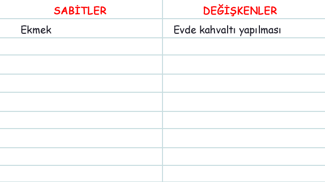 | GÖRSEL/KAHVALTI | SABİTLER | DEĞİŞKENLER |